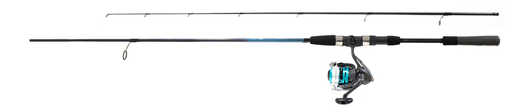 Ensembles leurre mer. Canne Firespin, à emmanchement inversé, en carbone et composite avec anneaux chromés monopattes. Moulinet FS frein avant garni de nylon en 30/100.
